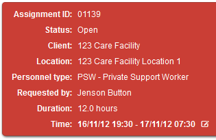 With a Red or Open assignment, the shortcuts include viewing this assignment's details and cancelling the shift.