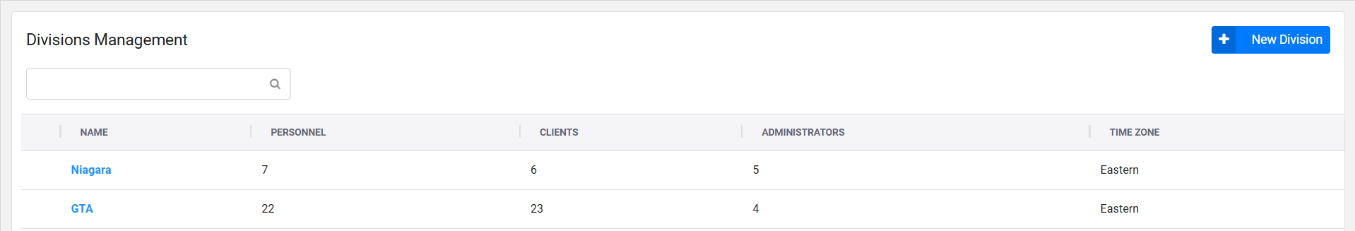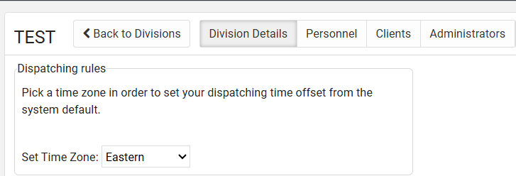 - The timezone set for the division will be applicable to all client locations, admins and personnel within the division.